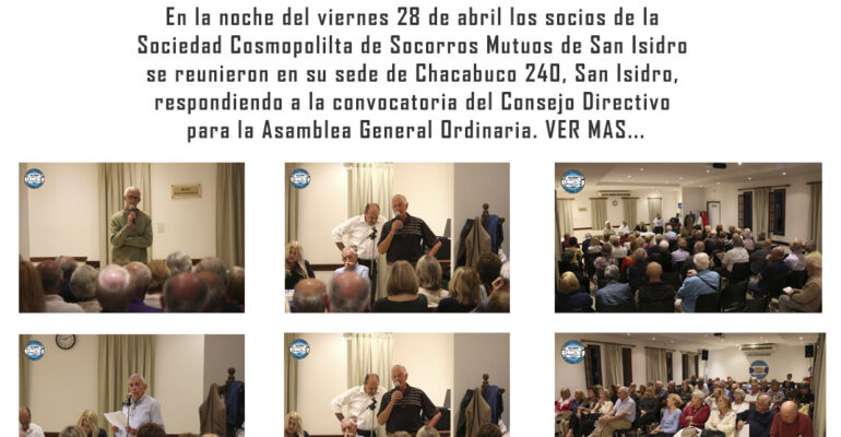 En la noche del viernes 28 de abril los socios de la Sociedad Cosmopolilta de Socorros Mutuos de San Isidro se reunieron en su sede de Chacabuco 240, San Isidro, respondiendo a la convocatoria del Consejo Directivo para la Asamblea General Ordinaria.